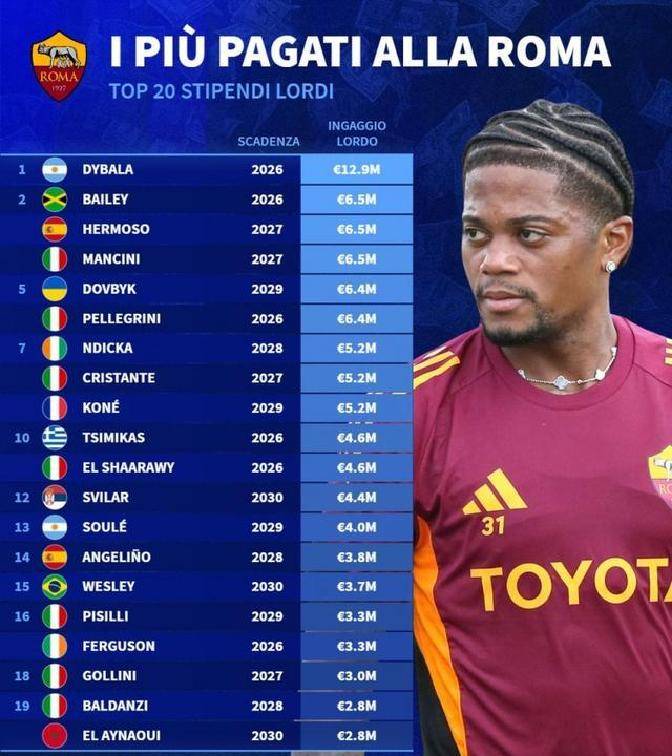 其中,薪资分布问题很突出。阿根廷球星迪巴拉税前年薪1290万欧元,是全队最高的。可他状态不稳定,引发了很多质疑。伤病和年龄影响了他,他拿这么高的薪水合不合理,值得讨论。罗马方面要是和他续约,可能会要求他大幅降薪。